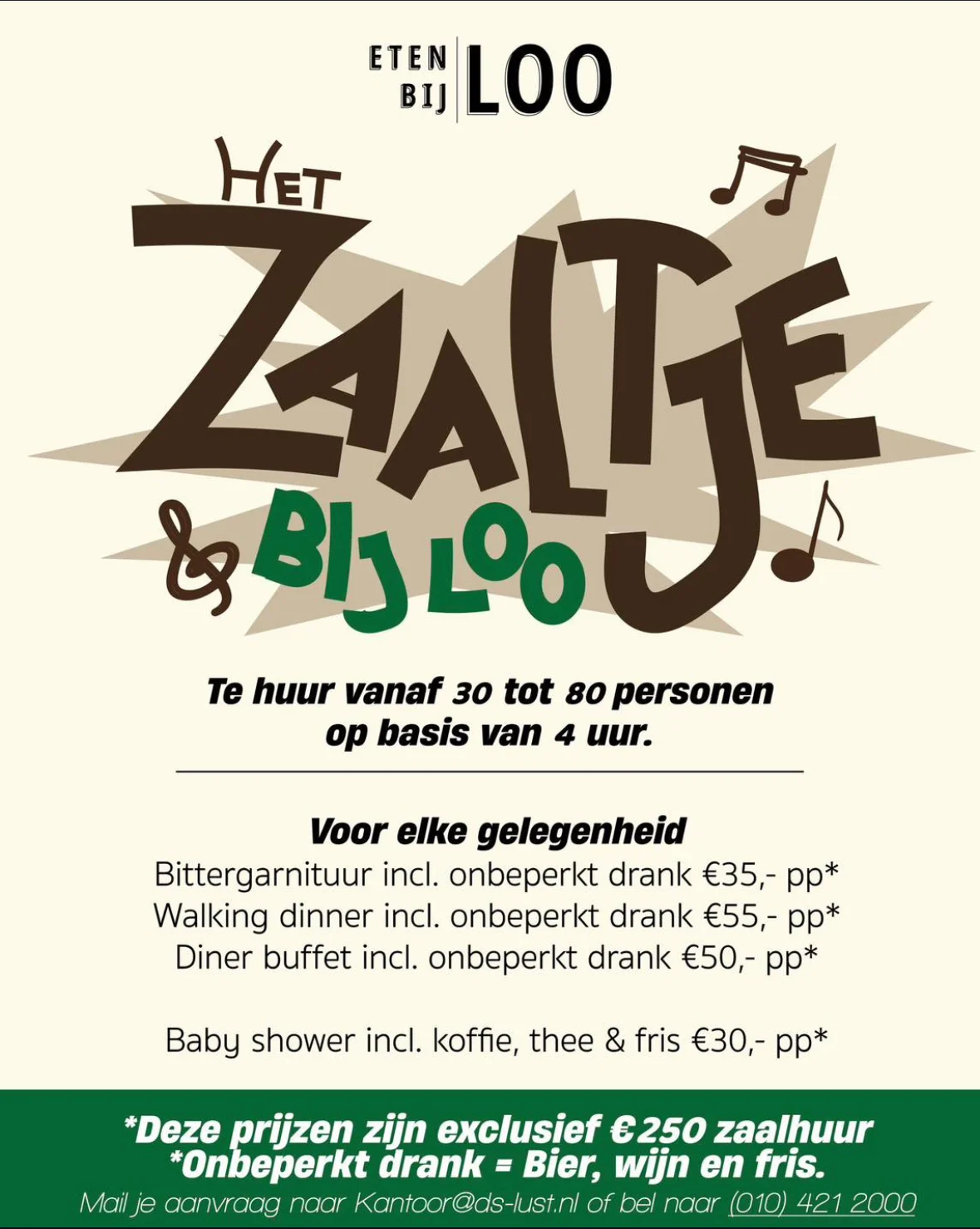 Zaal Bij Loo is een sfeervolle ruimte voor diverse gelegenheden. De intieme sfeer maakt dat de zaal geschikt is voor zowel een privé diners vanaf 15 personen, een vergadering voor bijvoorbeeld 30 personen als een feestje voor maximaal 80 personen.